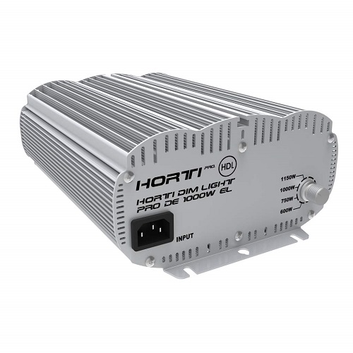 Horti Dim Light 1000 PROAlimentatore completamente elettronico con potenza operativa a 230 volt e funzione boost / dimming 600-1150W (2 anni di garanzia)Funzioni protettive:-Corto circuito-Lampada guasto-Undervoltage-Sovraccarico-TemperaturaInstallato in un robusto alloggiamento in alluminio con raffreddamento passivo, il ballast non necessita di ventola e funziona silenziosamente. Grazie all’avvio rapido integrato, la lampada raggiunge rapidamente la massima luminosità.Con il dimmer integrato è possibile variare facilmente l’emissione luminosa o la radiazione termica.Il ballast ha un rilevamento dinamico degli errori (sovraccarico / cortocircuito / lampada)Il ballast funziona senza problemi con un’umidità relativa compresa tra il 10% e il 90%.Horti Dim Light Pro 1000 è previsto per il montaggio a parete.