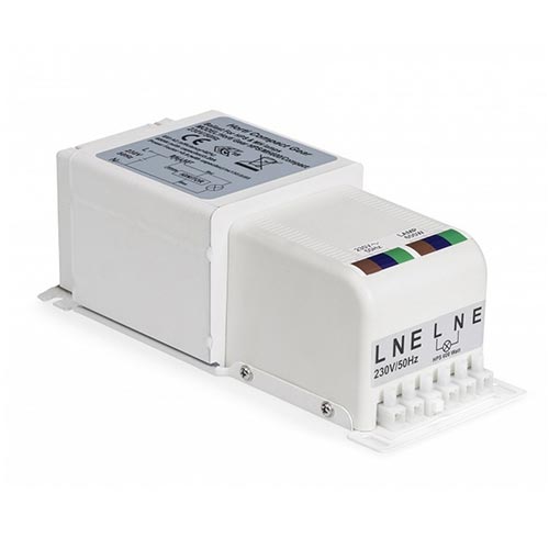 Questo robusto ballast è composto da un rettore di grosse dimensioni, condensatore, e accenditore.Il cablaggio avviene mediante una comoda morsettiere a vite per un fissaggio sicuro dei cavi.
