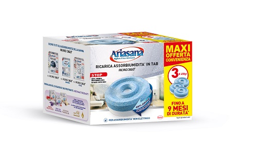 ARIASANA PURE AERO 360 3 x RICARICHE TABAriasana Aero 360° Tab ricarica, contiene tre pastiglie da 450 grammi ciascuna. Ideali se usate con Ariasana Aero 360° kit deumidificatore ambiente casa, per assicurare lunga durata e resa ottimale! La Tab ricarica universale è compatibile con la maggior parte dei deumidificatori con capacità di almeno 450g.