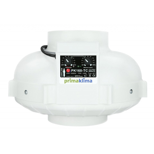 Prima Klima AC PK160-TC Temperature ControlledPrima Klima PK160-TC è un aspiratore da condotto in linea a due velocità altamente efficiente dotato di un motore centrifugo RadiCal ebm-papst con pale curve all’indietro, adattato in modo ottimale all’alloggiamento.