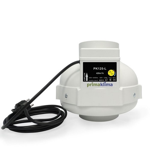 Prima Klima AC PK150-L 125mm Prima Klima PK125-L è un aspiratore in linea ad alta efficienza dotato di un motore centrifugo MES AC a velocità singola con pale curve all’indietro che è stato adattato in modo ottimale all’alloggiamento.