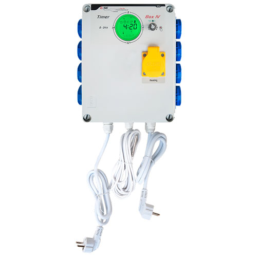 Gse Timer Box IV 8 x 600w + HeatingGse Timer Box IV 8 x 600w + Heating controlla e temporizza lampade HID, HPS, MH, CMH con un’elevata corrente di spunto. Gse Timer Box IV ha un display digitale basato su un timer meccanico di 24 ore, controllabile e configurabile con un pulsante touch, un modo veloce e semplice per impostare l’orologio e il timer meccanico.