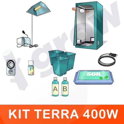 Economiche e funzionali, il giusto compromesso per tutti gli appassionati del settore.I nostri kit di coltivazione sono la scelta ideale per la germinazione, il taleaggio, il mantenimento delle piante madri e la crescita.Tutti i kit sono venduti pronti all’uso e comprendono:Grow Box 100x100x200, riflettore con attacco E40, lampada HPS, cavi di alimentazione, trasformatore elettromagnetico, estrattore tubo 125mm, vasi, terra, kit di fertilizzanti per crescita e fioritura, test per ph e correttore, montaggio plug&play.Spazio di coltivazione da 1 a 1,2 m²La soluzione ideale per tutti coloro che necessitano di una soluzione compatta e semplice.Alta qualità dei materiali, certificati e garantiti.IL KIT HPS TERRA CONTIENE: SPECTRUM GROW BOX CLASSIC 100Spectrum Grow Box Classic 100, telaio in alluminio leggero, con connessioni in plastica, telo riflettente tipo Mylar 600D, chiusura ermetica. Qualità costruttive e materiali di ultima generazione. Misura 100x100x200.KIT SPECTRUM HPS 400W SYLVANIA GROLUXKit HPS 400W Agro, bulbo Sylvania Grolux 400w, ai vapori di sodio, per la fase di crescita e fioritura + Alimentatore termomagnetico Spectrum Grow Line Ballast 400w, con condensatore e protezione contro sovraccarichi e surriscaldamento.