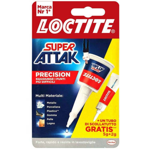LOCTITE SUPER ATTAK PRECISION 5G+2G SCOLLATUTTOAdesivo istantaneo liquido di facile applicazione grazie allo speciale beccuccio, può essere dosato in modo ottimale esercitando una leggera pressione sul flacone o sul tubetto.Il cappuccio è dotato di ago anti-otturazione: in questo modo il prodotto non secca, non cola ed è sempre pronto all’uso.Ideali per l’incollaggio di gomma, metallo, ceramica, legno, cuoio, pelle e vari tipi di plastica (tranne PE, PP, PTFE).SCOLLATUTTORimuovi Colla è la soluzione ideale per la maggior parte degli inconvenienti derivanti dall’uso di colla.Può rimuovere qualsiasi cianoacrilato (quale Super Attak) e altri tipi di colla da oggetti incollati male, superfici macchiate, tessuti, adesivo.Adatto per eliminare tracce di etichette, rifinisce gli incollaggi da sbavature.Grazie alla sua formula in gel, non cola e aderisce facilmente alle superfici verticali.