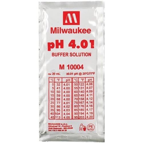 Box Ph 4.01 buffer solution – MilwaukeeBusta di soluzione tampone calibratrice pH 4.01 Milwaukee, per calibrare misuratori di pH.PH 4,01 con accuratezza +/-0,01 pH. Modo d’uso:Aprire la busta, inserire l’elettrodo e calibrare secondo le istruzioni di ogni misurino.Adatta per qualsiasi misuratore. Bustina da 20ml con soluzione +-0.01 ph / 25ºC.