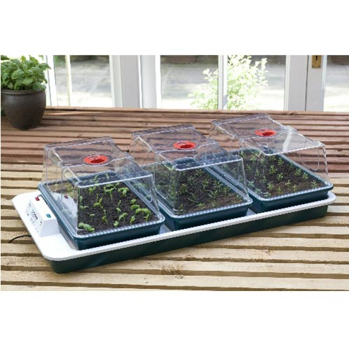 3 propagatori elettrici con controllo temperaturaE’ stato studiato per il giardiniere professionista, per germogliare semi in quantità oppure per l’attecchimento delle talee.La base contiene tre propagatori in plastica delle misure:36,5 lunghezza,22cm profondità.La base contiene degli elementi di fibre di carbonio da 50w per scaldare tutta la superfice.Dimensioni: 80.5cm (l) x 41cm (w) x 20.5cm (h)